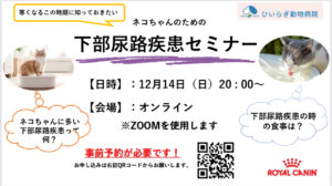 12月は、12月14日に以下の通り飼い主さん向けセミナー(当院にカルテのある方が対象です)を実施します。申し込みが必要となりますのでQRコードを読み取りお申し込みください。